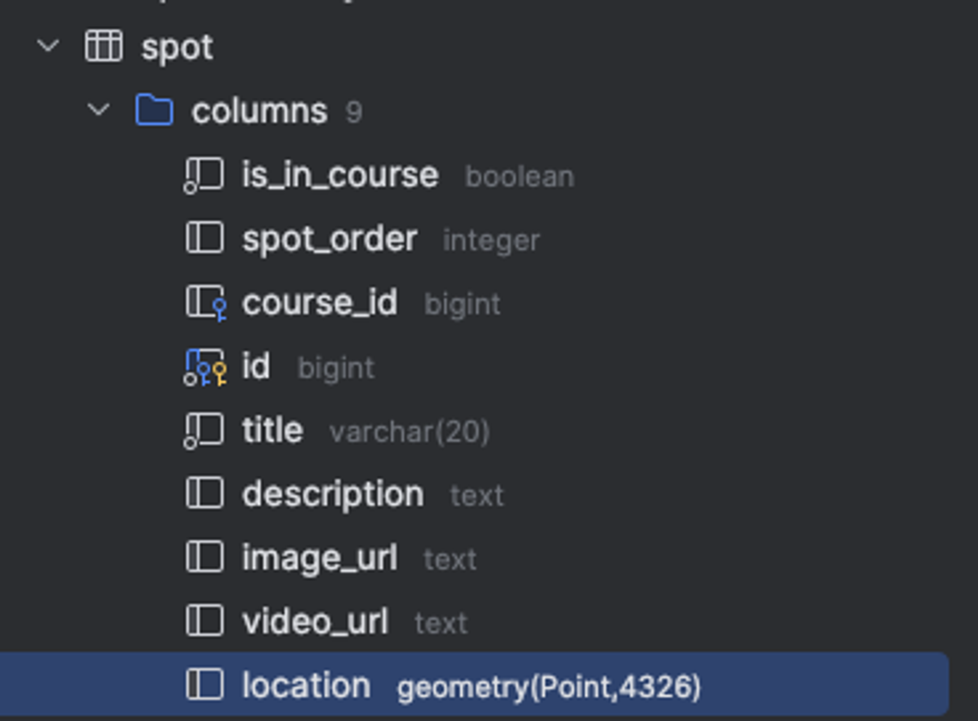 Hibernate가 Geometry 타입을 인식하고 PostGIS 스키마에 맞춰 컬럼을 생성합니다.