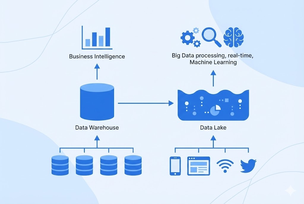 즉, 데이터 레이크는 토대, 데이터 웨어하우스는 분석 엔진, 데이터베이스는 서비스 운영 엔진으로 역할을 분담하여 전체 데이터 흐름을 구성합니다.