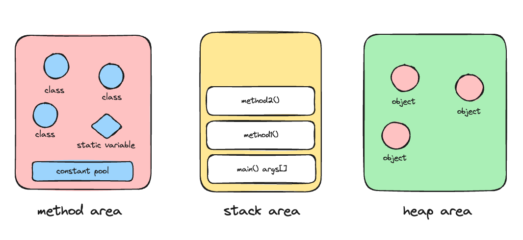 - 메서드 영역, 힙, 스택이 각각 어떤 역할을 하는지