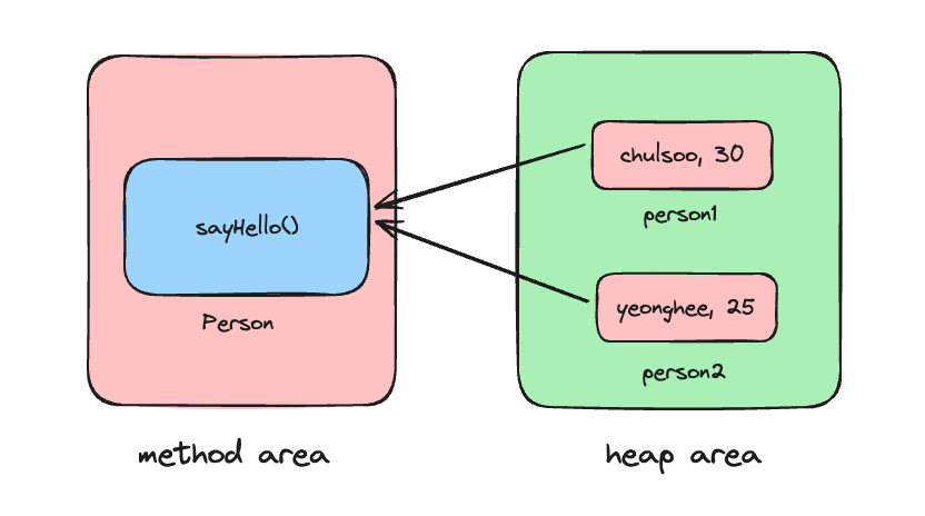 즉, Person 클래스가 처음 JVM에 로드될 때, sayHello의 메서드 코드는 메서드 영역에 한번만 배치되며 모든 Person의 인스턴스가 해당 메서드를 공유하여 사용할 수 있습니다.