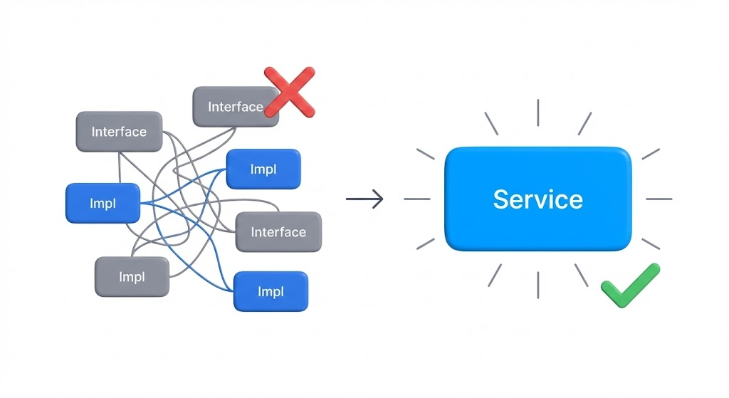 결론부터 말씀드리면, 이 글은 ServiceImpl을 쓰지 마세요가 아니라 서비스 인터페이스는 정말 필요한 순간에만 쓰자에 더 가까워요.