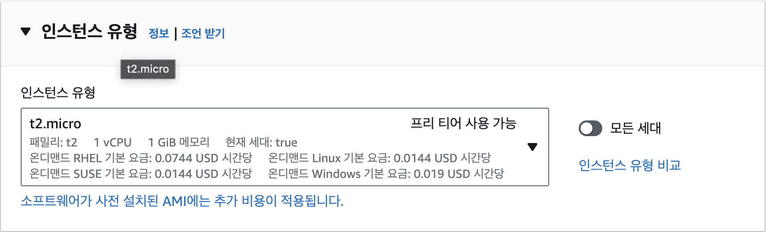 학습 목적이고 프리 티어를 활용할 예정이므로, Free Tier eligible(프리 티어 사용 가능) 표시가 있는 다음 타입 중 하나를 선택합니다.