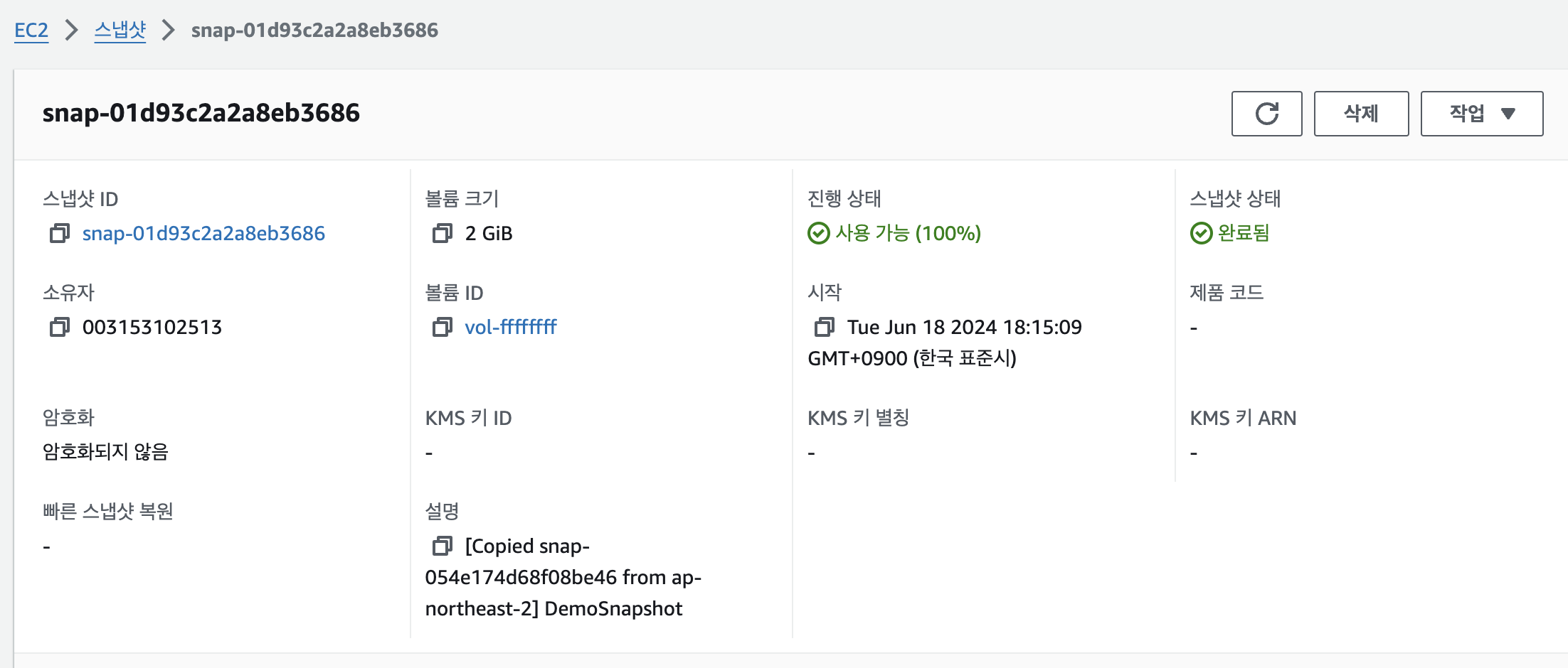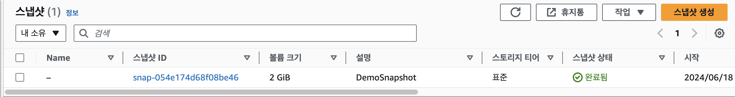 아까 생성한 2기가 볼륨의 스냅샷을 생성할 건데요, 스냅샷으로 만들 볼륨을 체크한 후 우측 상단 작업 > 스냅샷 생성을 클릭합니다.