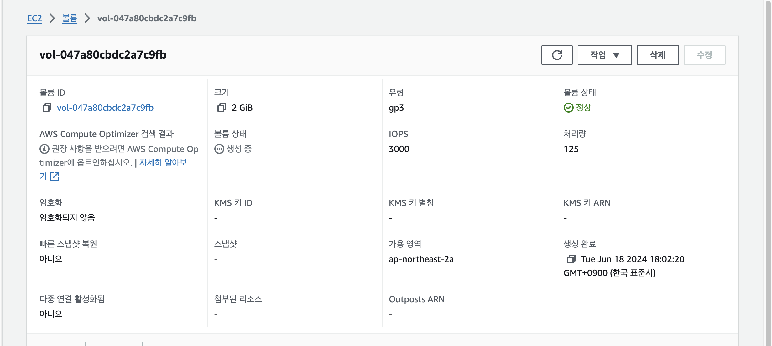 이후 IOPS와 처리량은 기호에 맞게 설정하면 되는데요, 중요한 점은 가용 영역을 아까 EBS와 같게 해야합니다. 그래야 해당 EC2에 연결이 될 수 있겠죠? 이후 아래 생성버튼을 눌러 볼륨을 생성해봅시다.