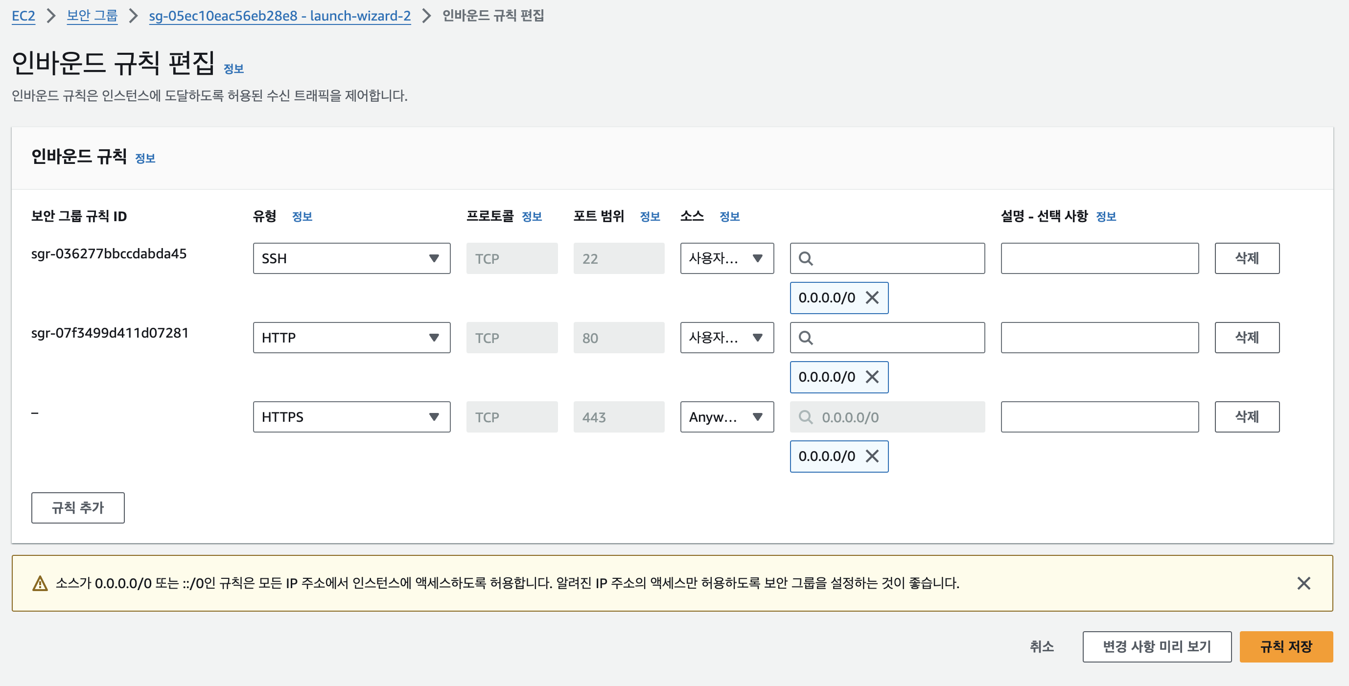 이번 실습에서는 학습 편의를 위해 다음 포트를 열어둘게요.