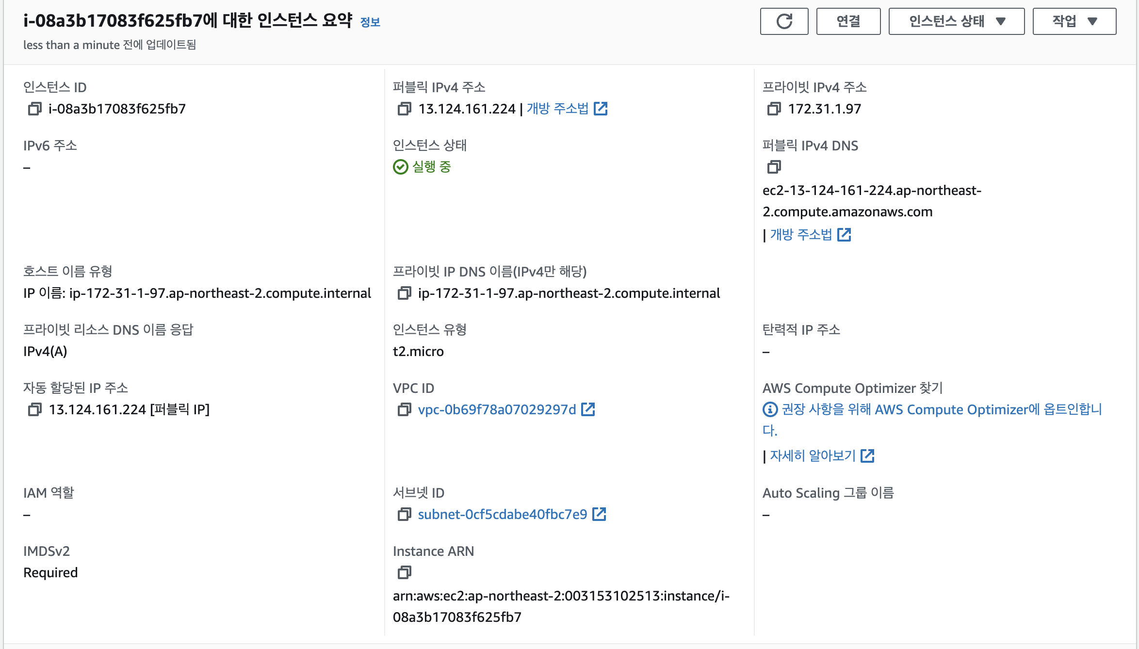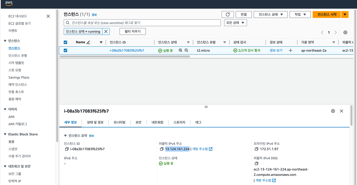 이제 인스턴스 메뉴로 돌아가서 확인해봅시다.