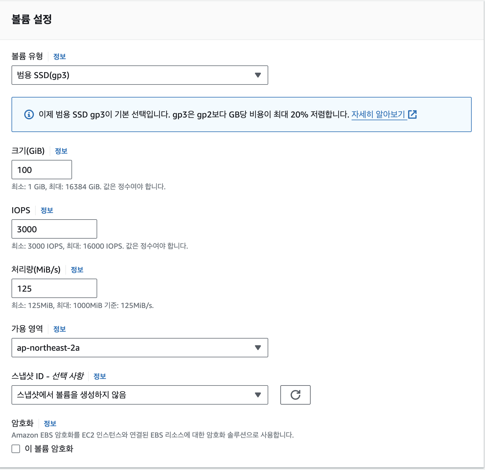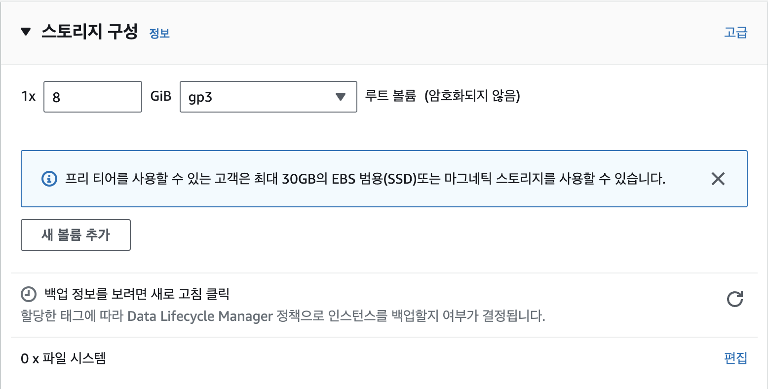 먼저 볼륨 설정을 하는데요, 크기는 30기가 이상이면 과금이 되므로, 그 안에서 설정합니다. 저는 2기가로 설정하겠습니다.