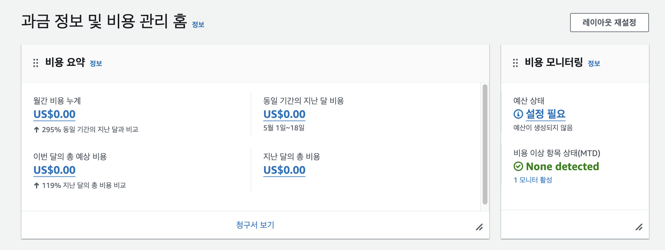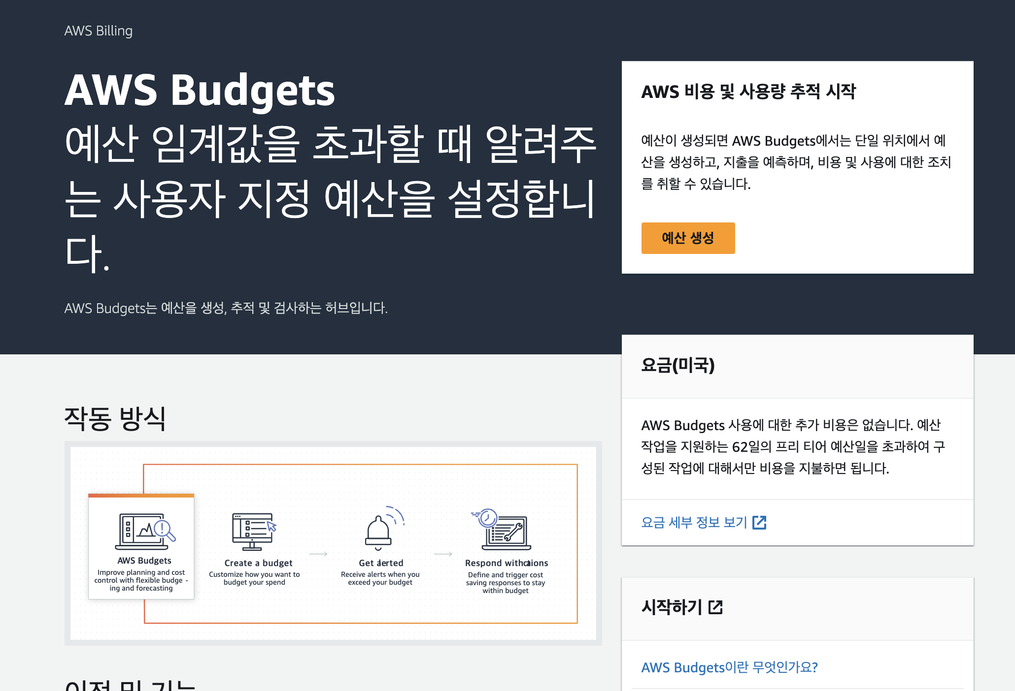 - 예기치 않은 요금 발생을 조기에 감지하기 위해 AWS 예산(Budget)을 설정해요.