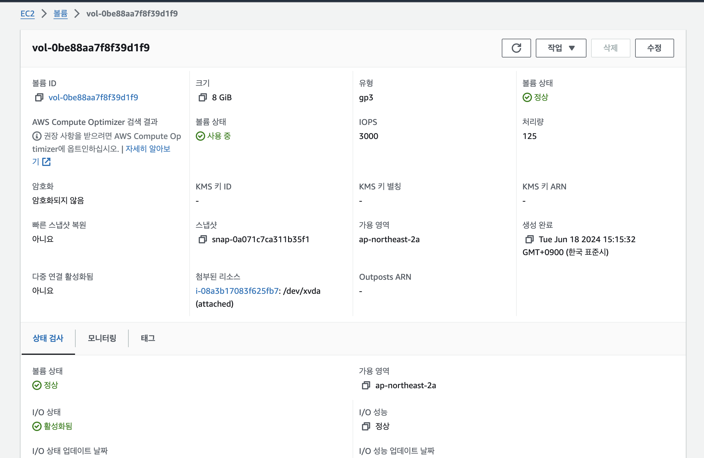 EC2 콘솔 좌측에 볼륨 메뉴로 들어가면 아까 EC2 인스턴스를 생성하며 함께 생성된 EBS 볼륨을 확인할 수 있습니다.
