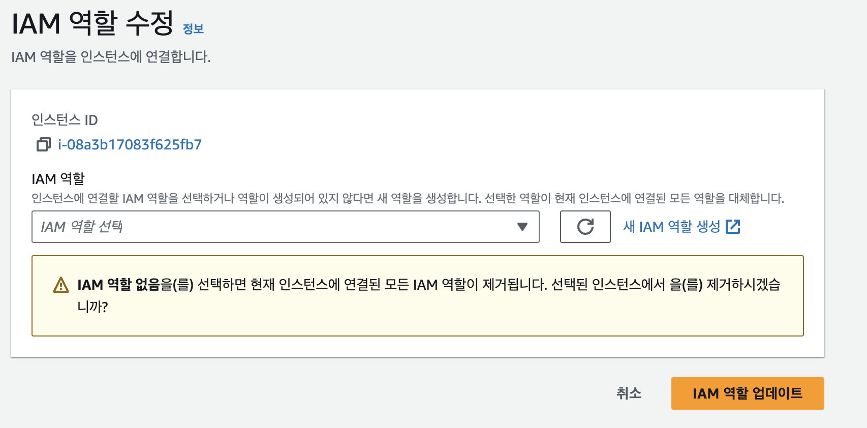 EC2 인스턴스에 접속한 상태에서 우측 상단 작업 버튼을 눌러 보안 > IAM 역할 수정 으로 이동합니다.