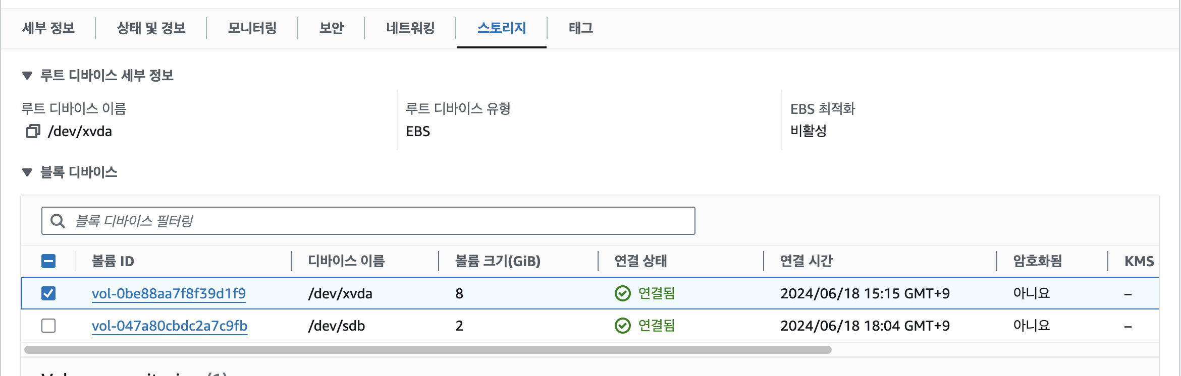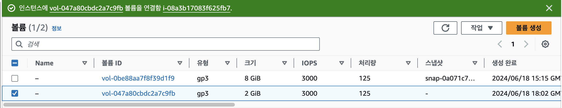 EC2에 볼륨이 기존의 8기가 짜리에 더해 2기가짜리 볼륨 하나가 추가로 생성되었음을 확인했습니다!