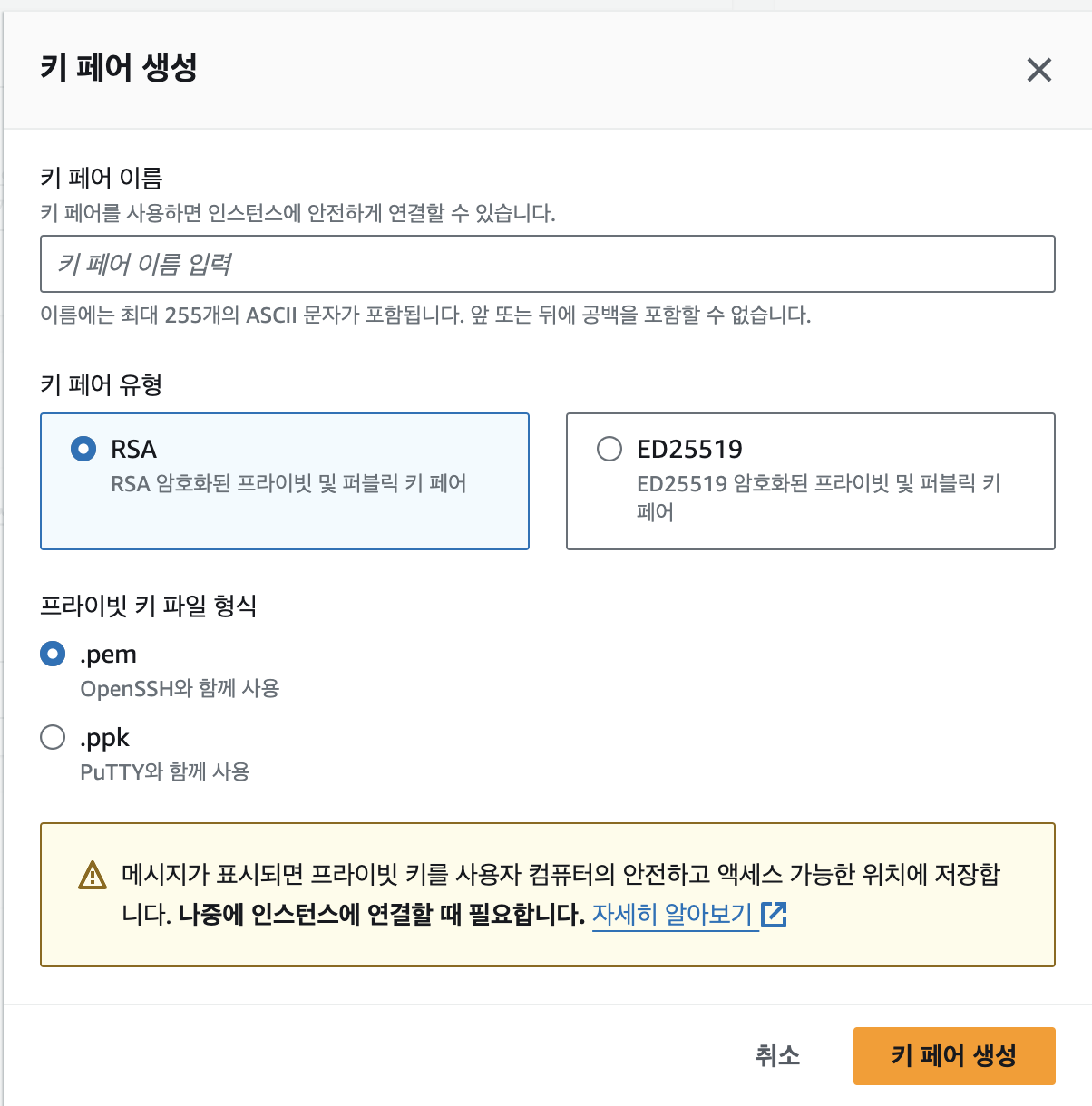 - 키 페어 이름: 원하는 이름 (예: