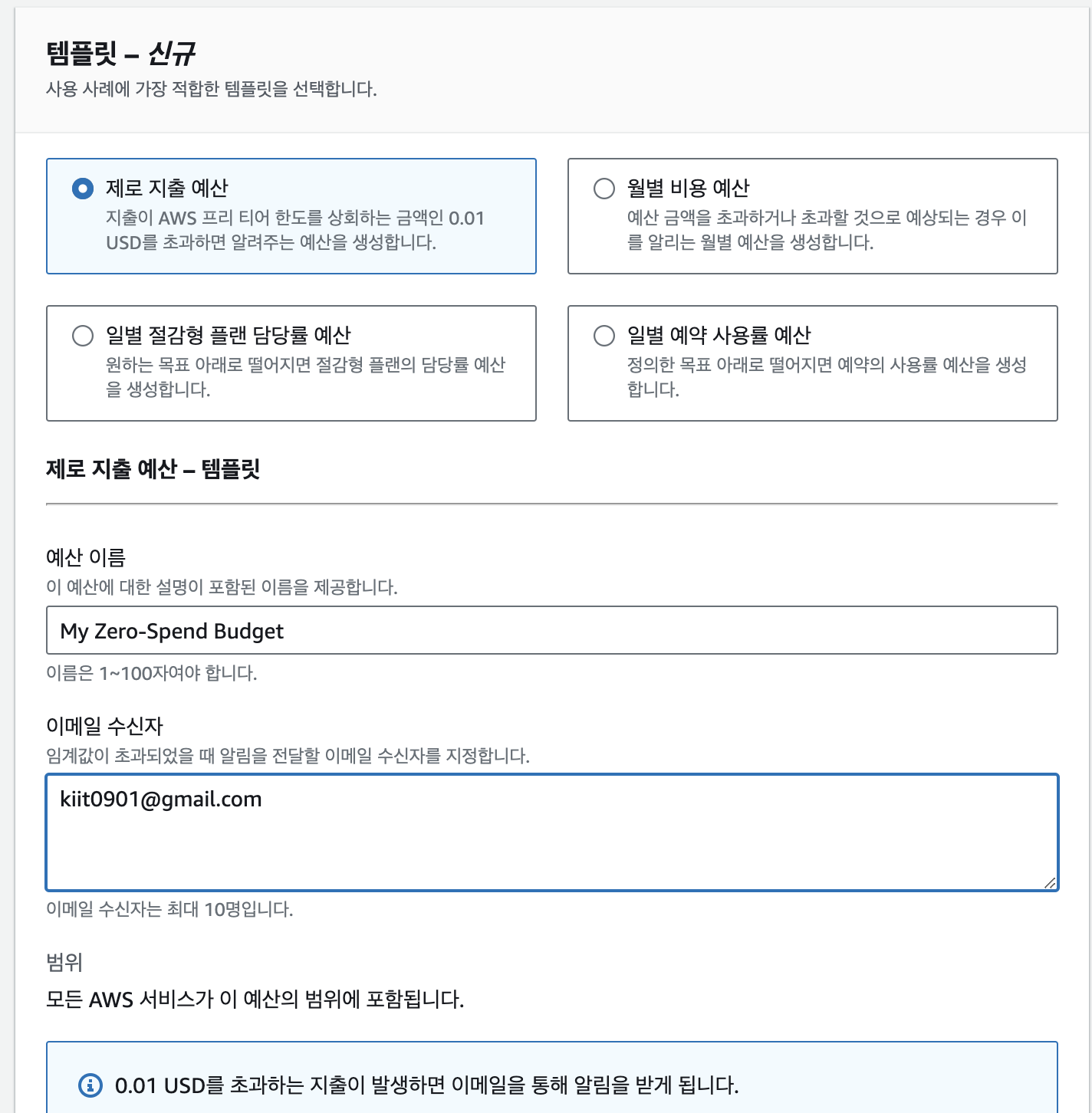 이 템플릿은 Free Tier 한도를 초과하거나, 0.01달러 이상의 지출이 발생하면 이메일 알림을 보내줘요.