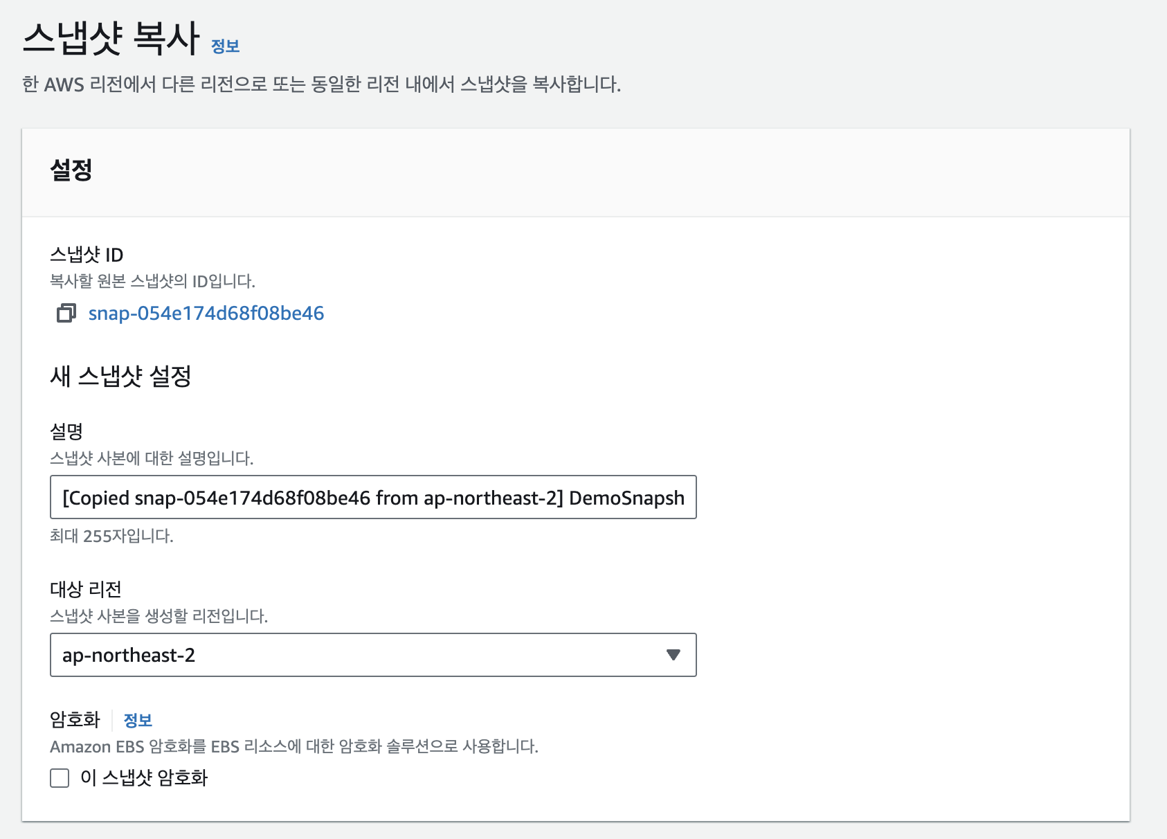 이후 스냅샷 생성때와 같이 설명을 누르고 이동시킬 리전을 선택합니다. 저는 ap-northeast-1 로 이동시켜보겠습니다.