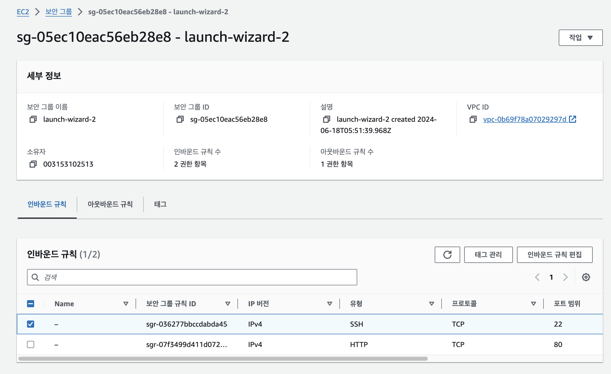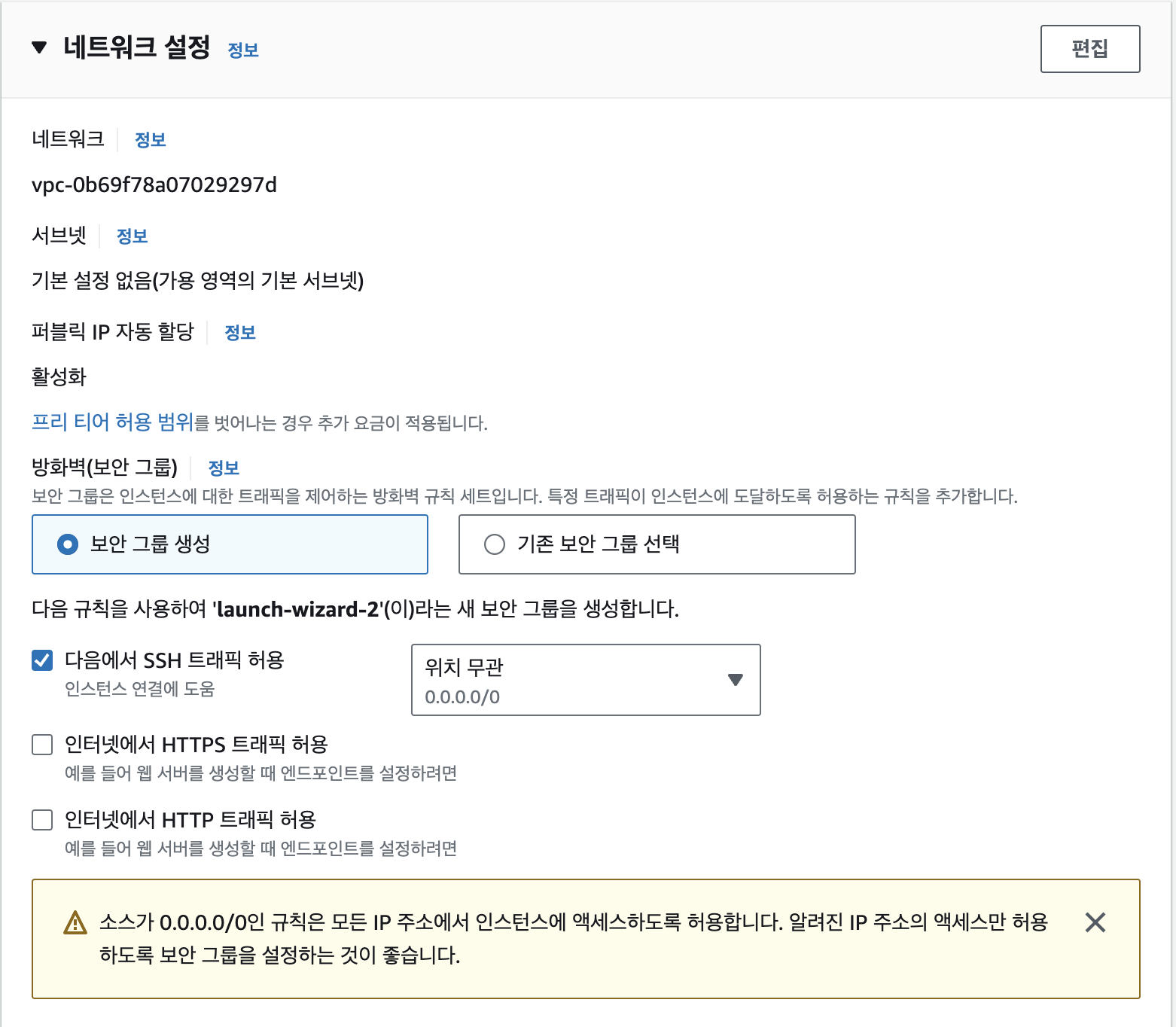 여기서 보안 그룹(Security Group)을 생성하거나 선택할 수 있어요.