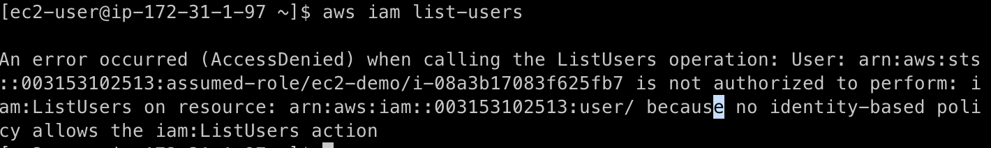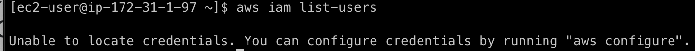는, 사실 제가 준 역할에는 해당 권한은 없네요... 굳이 필요없는 권한이라 주지 않도록 하겠지만 최소한 필요로 하는 권한을 주도록 합시다. 우선 자격증명은 회피할 수 있게 되었네요 ㅎㅎ (IAMReadOnlyAccess 권한을 주면 해당 명령어가 실행된다고 합니다)