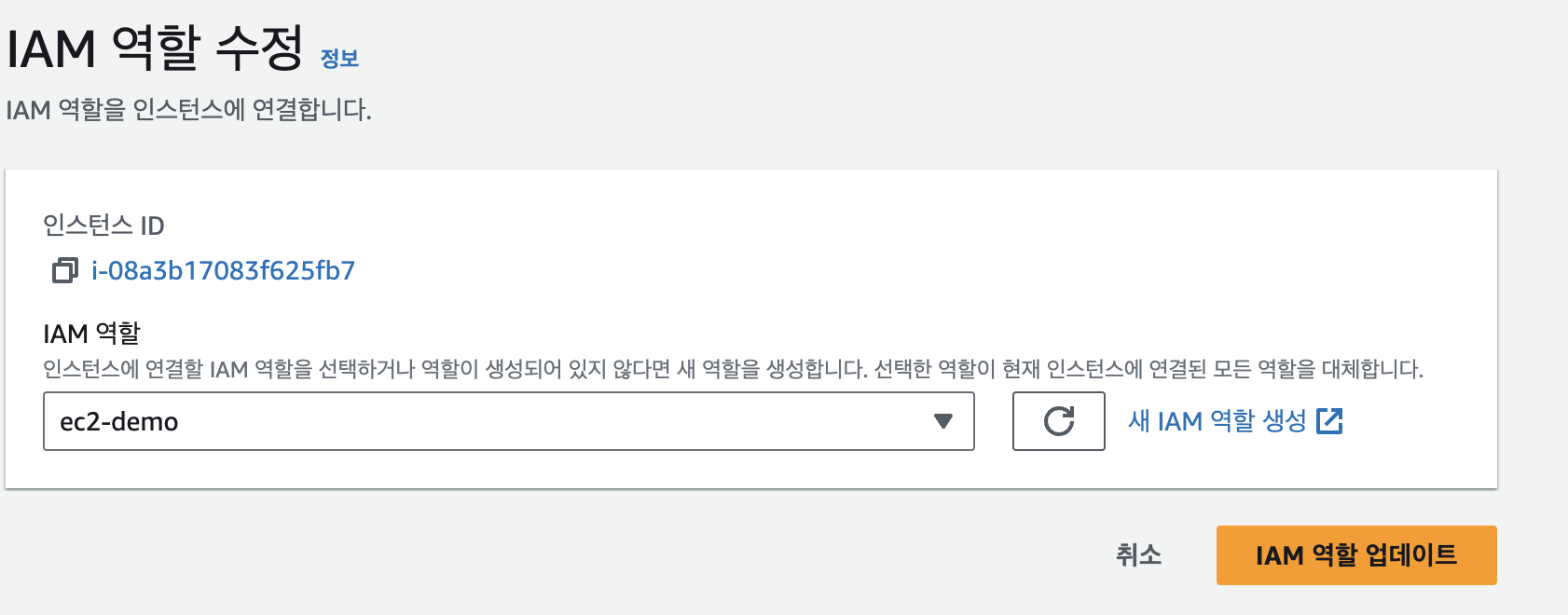 이제 새롭게 생성한 역할을 주어 자격 증명을 대체할 수 있게 됩니다. 이제 EC2에서 IAM에 접근할 권한이 있기 때문에 바로 명령어를 실행할 수 있을 겁니다.