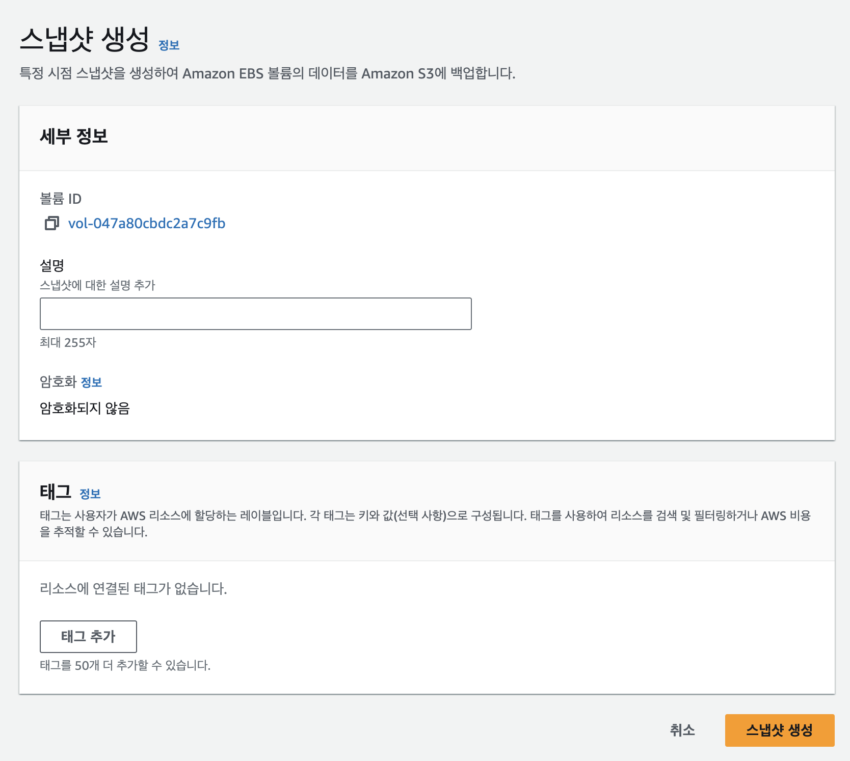 해당 스냅샷을 식별할 수 있도록 설명과 태그를 부착 후 생성합니다.