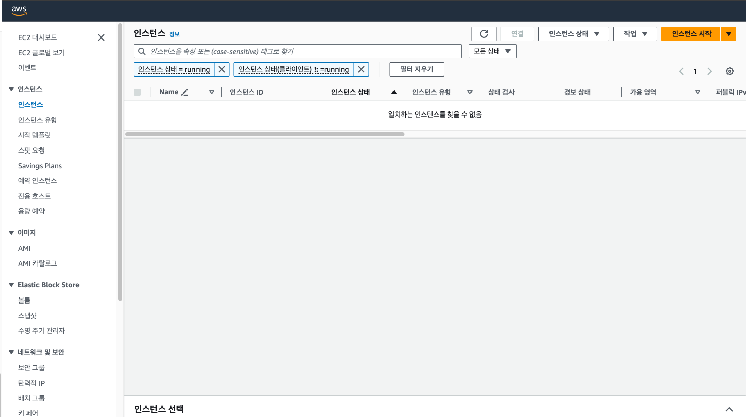 우측 상단의 인스턴스 시작(Launch instance) 버튼을 클릭합니다.
