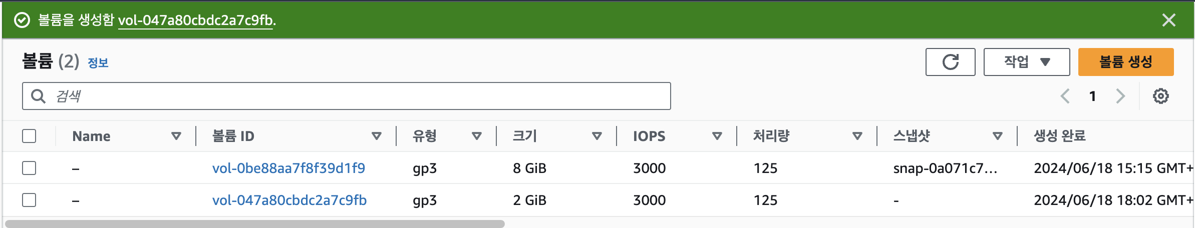 이렇게 현재 볼륨이 생성되어 사용중임을 알 수 있습니다.
