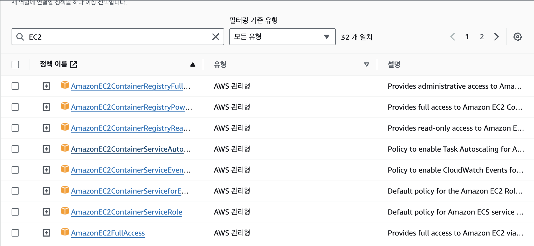 저는 맨 아래에 AmazonEC2FullAccess 권한을 주도록 하겠습니다.