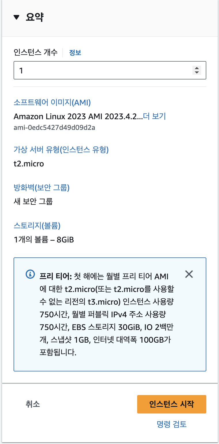 - 프리 티어(Free Tier)에 포함된 EC2 인스턴스(t2.micro 또는 t3.micro)를 직접 생성해요.