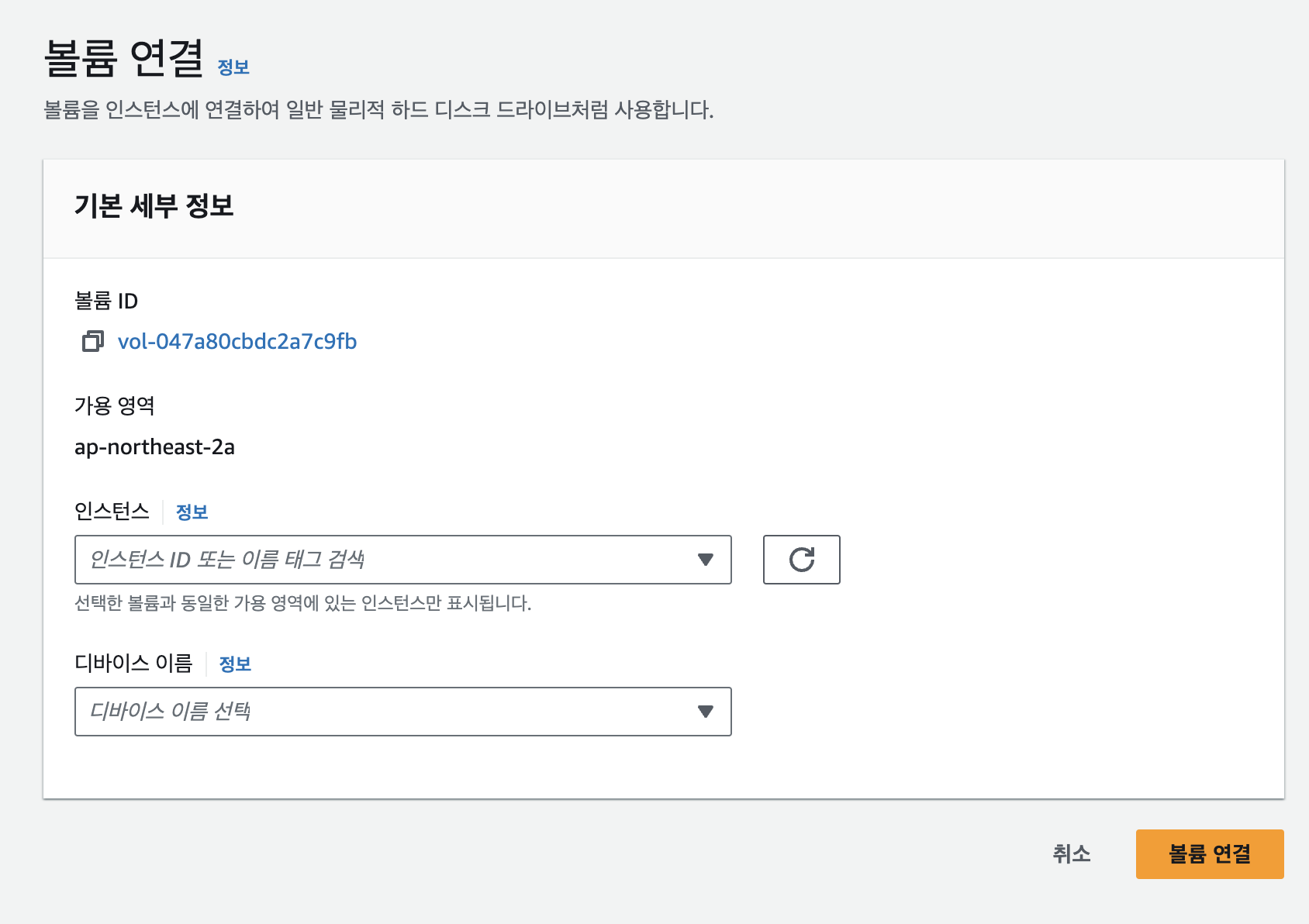 이후 연결할 인스턴스를 선택하여 볼륨 연결 버튼을 눌러봅시다. 그러면 볼륨 연결이 완료됩ㄴ디ㅏ.