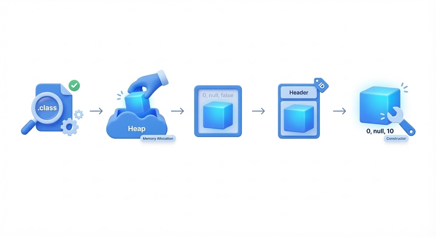 클래스 정보가 준비된 뒤 new가 실행되면, JVM은 객체를 다음 5단계로 생성해요.