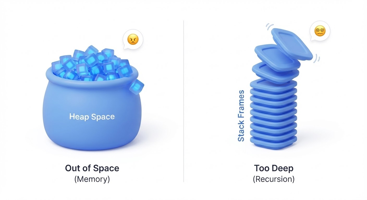 힙에 객체가 과도하게 쌓이면 OutOfMemoryError가 발생하고, 호출 스택이 지나치게 깊어지면 StackOverflowError가 발생해요.
