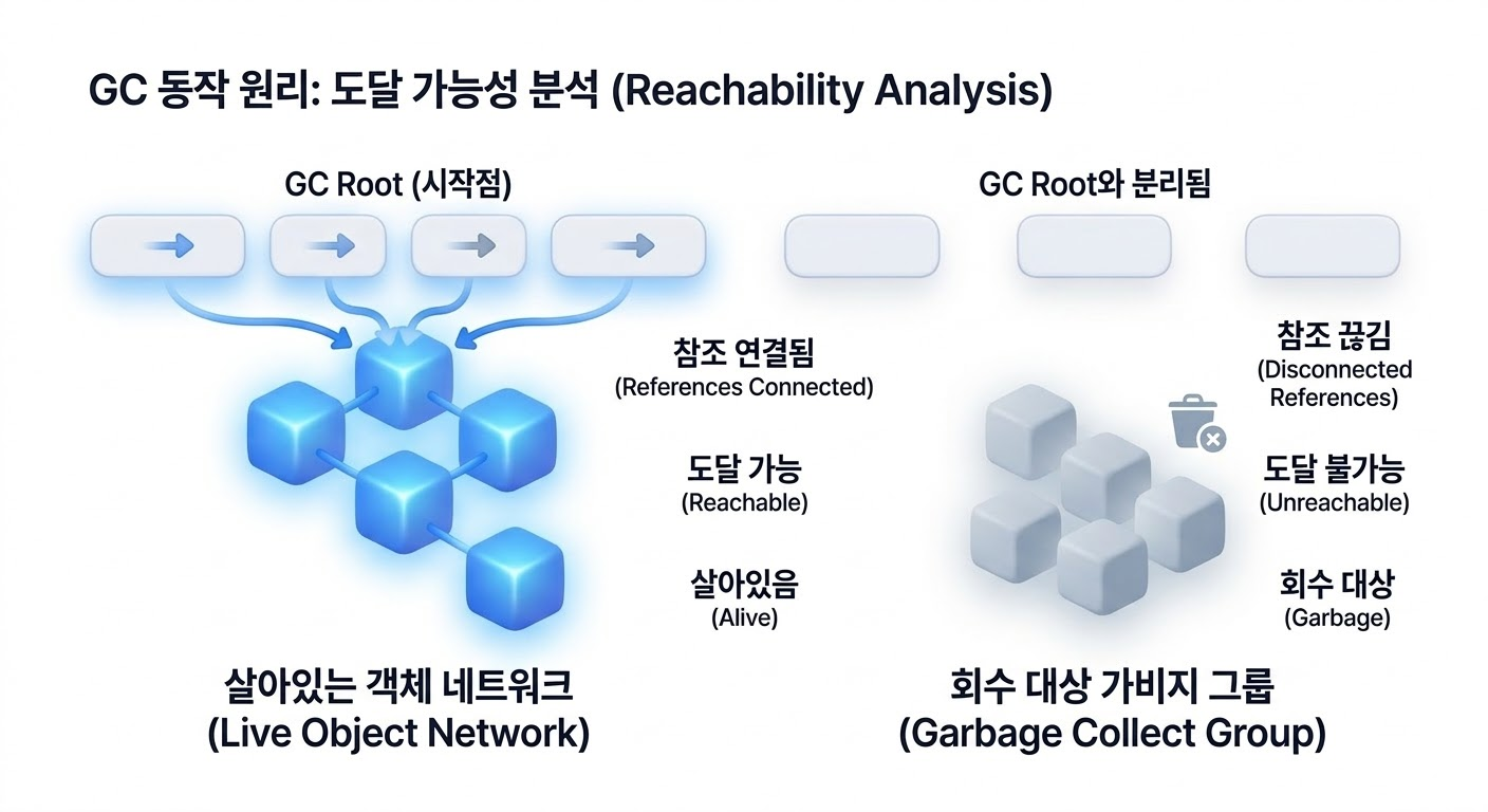 바로 이 한계 때문에 현대 JVM은 단순히 참조 수를 세는 대신, 실제로 도달 가능한 객체인지를 기준으로 생존을 판단합니다.