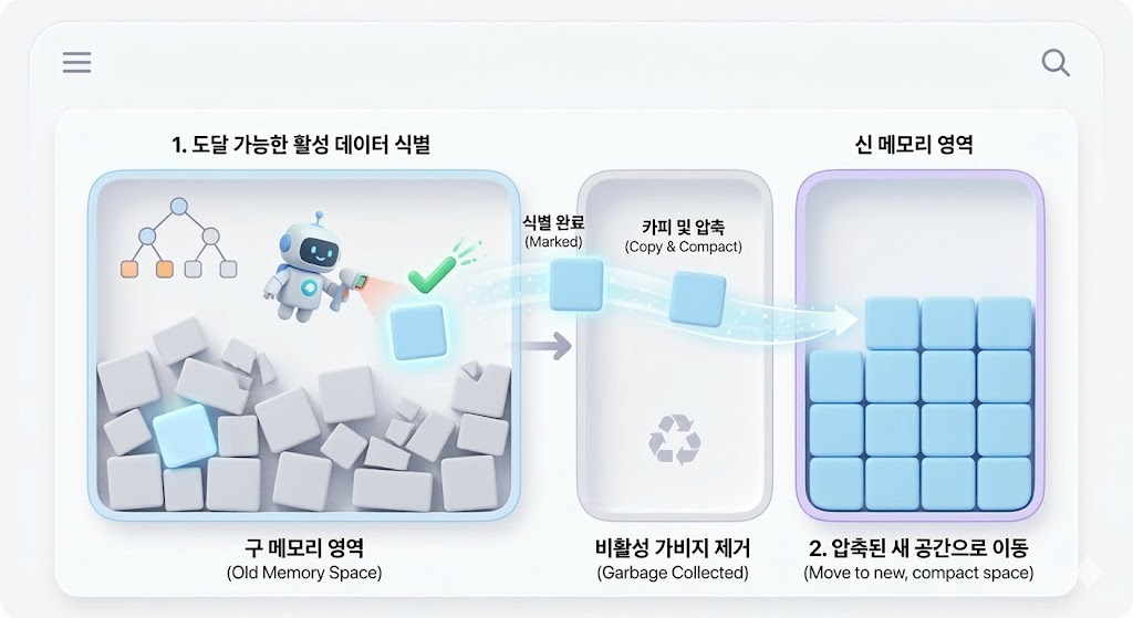 메모리를 두 구역으로 나누고, 살아있는 객체만 새로운 구역으로 복사(Copy)한 뒤 기존 구역을 통째로 비워버리는 방식이에요.
