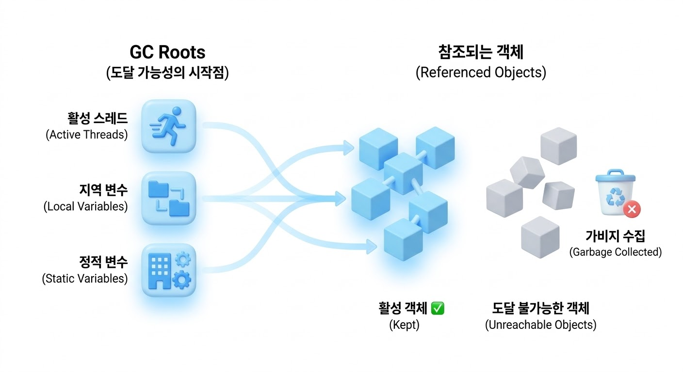 이 밖에도 실행 중인 스레드나 JVM 내부 구조가 유지하는 참조들이 포함될 수 있어요.